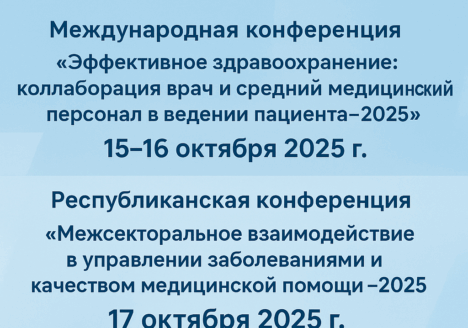 ОТКРЫВАЕМ РЕГИСТРАЦИЮ НА МЕЖДУНАРОДНУЮ КОНФРЕНЦИЮОТКРЫВАЕМ РЕГИСТРАЦИЮ НА МЕЖДУНАРОДНУЮ КОНФРЕНЦИЮ «Эффективное здравоохранение: коллаборация врач и средний медицинский персонал в ведении пациента-2025» 15-16 октября 2025 г., а также на РЕСПУБЛИКАНСКУЮ КОНФРЕНЦИЮ «Межсекторальное взаимодействие в управлении заболеваниями и качеством… 30 сентября, 2025